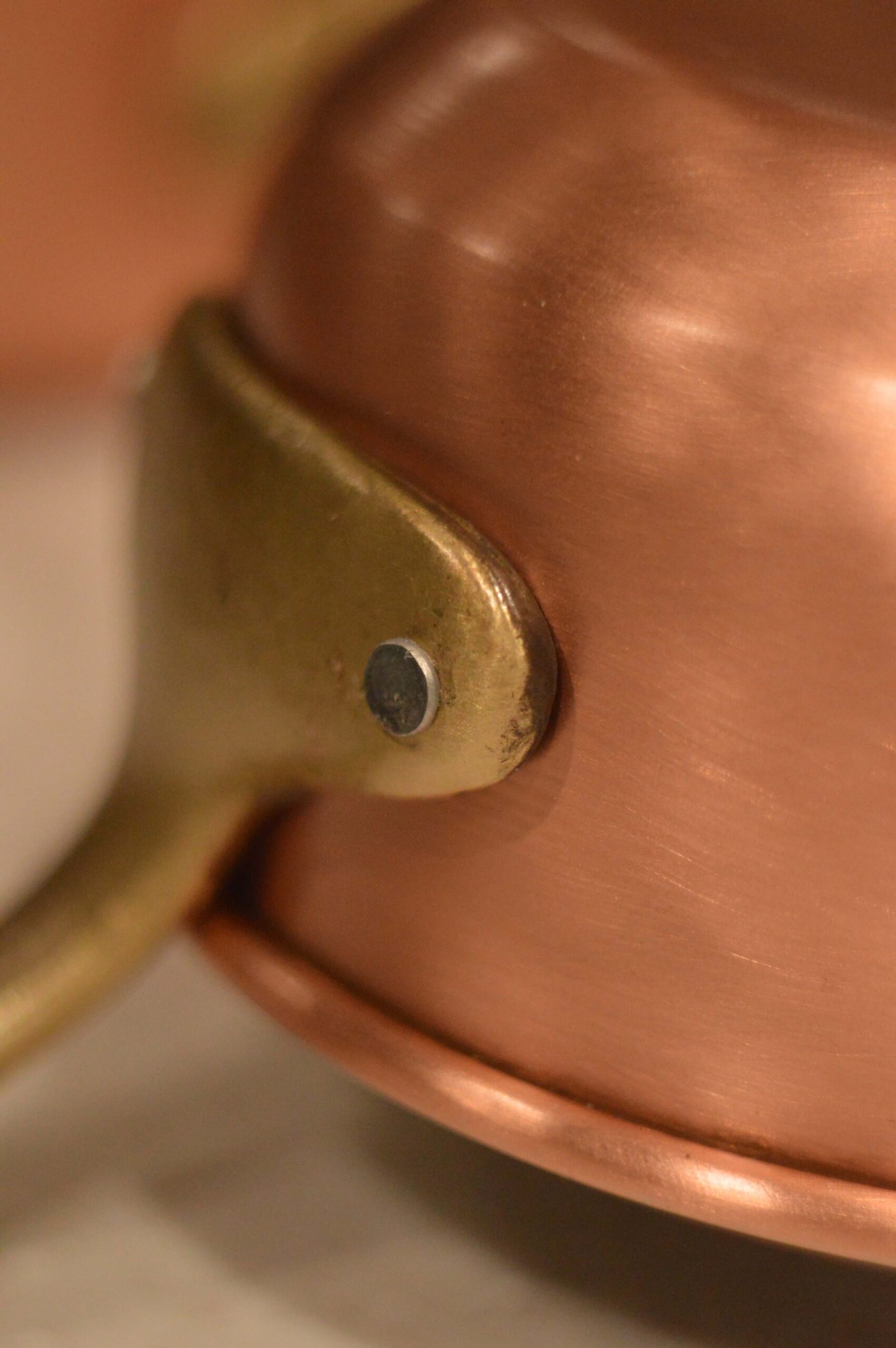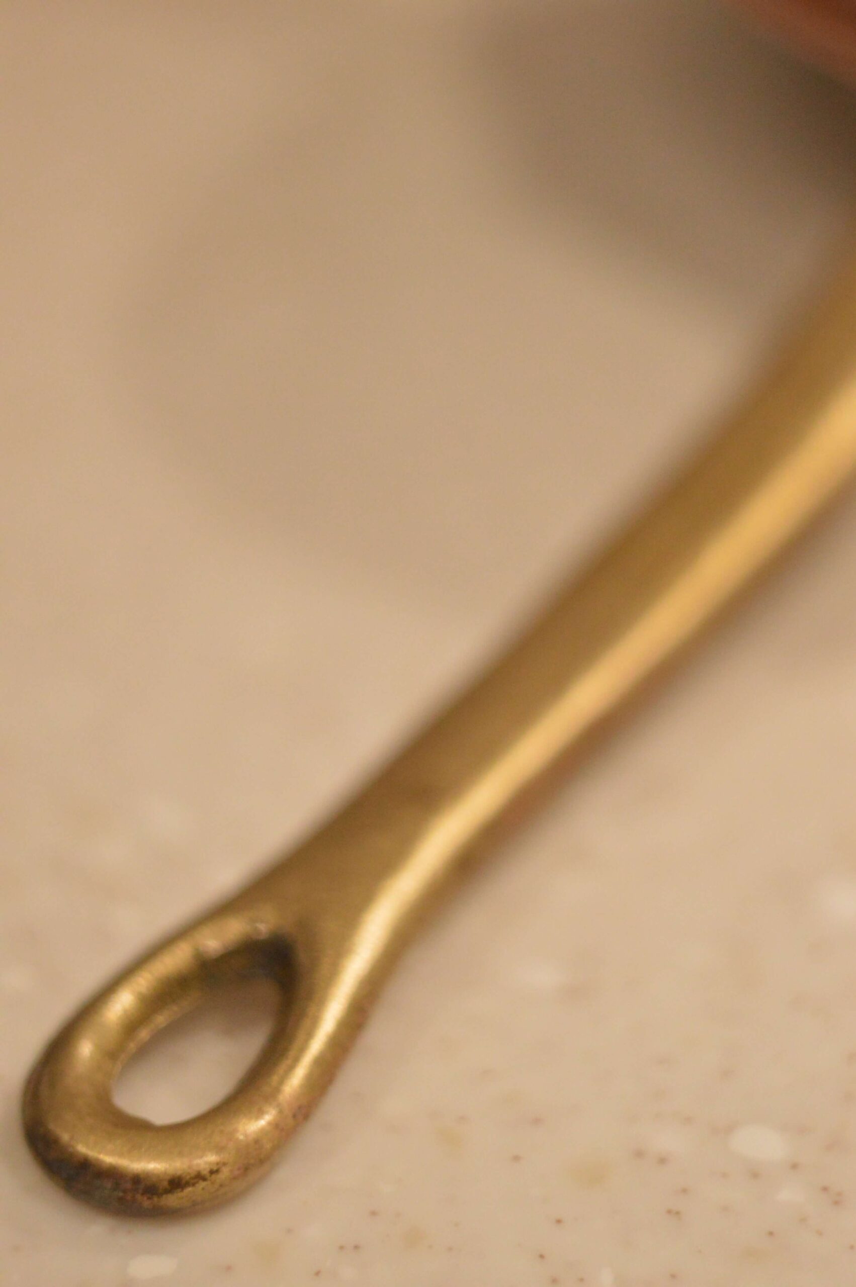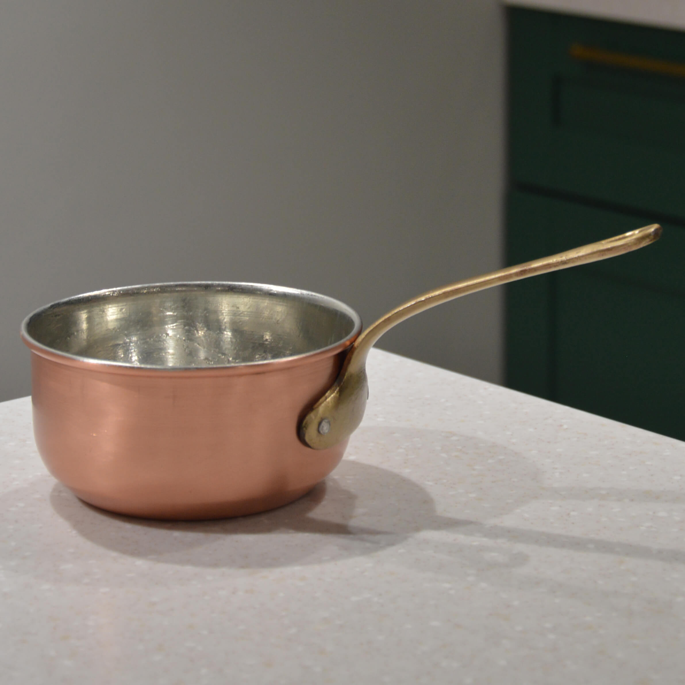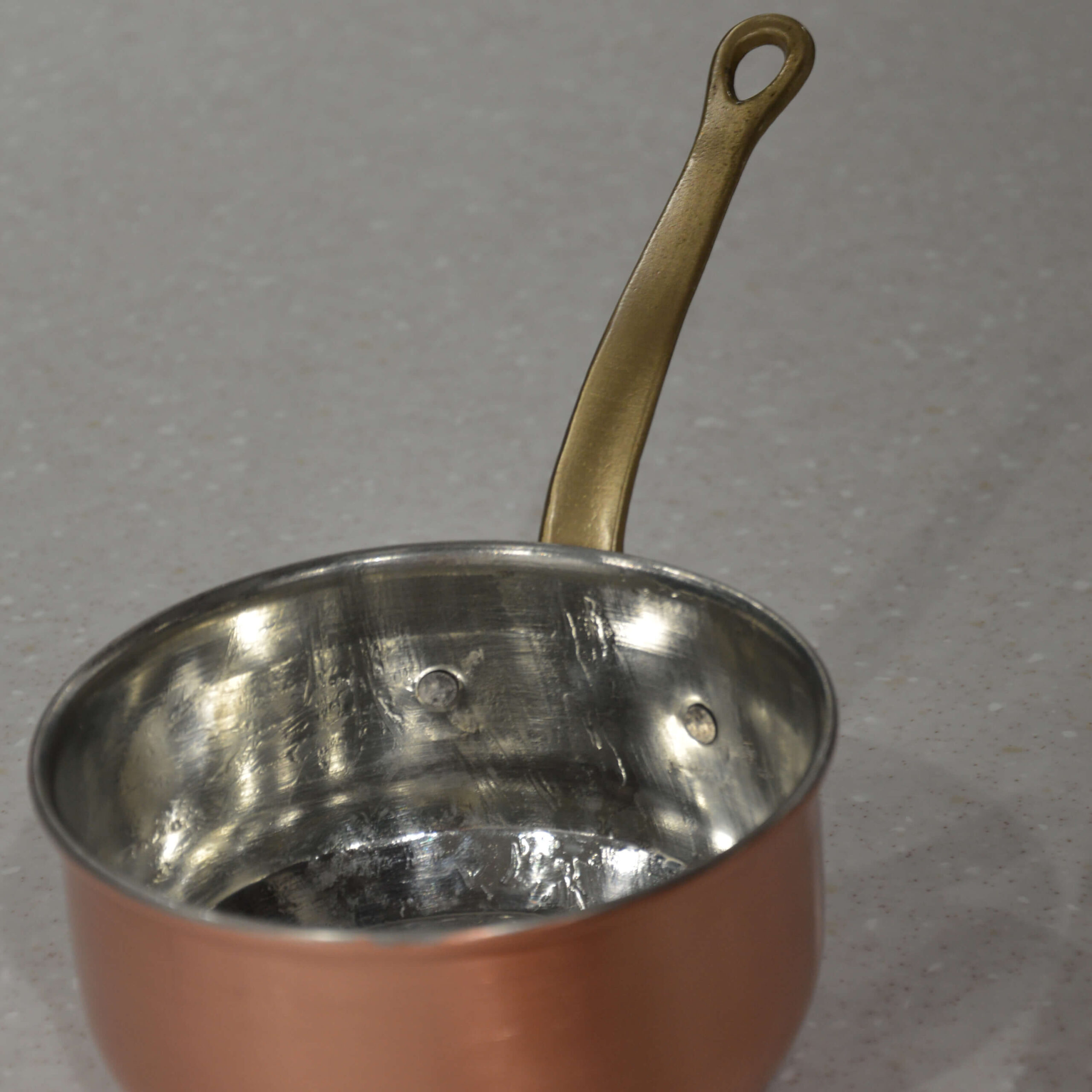Медный сотейник используется для приготовления соусов. Для защиты от окисления, изнутри изделие покрыто пищевым оловом. Ручка изготовлена из латуни.